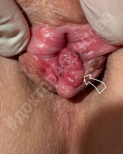 Наиболее частая причина выделения крови вне дефекации — это полностью выпавший внутренний геморроидальный узел (как на фото).