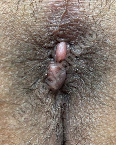 На этом фото — воспаленные, отекшие, болезненные наружные геморроидальные узлы с тромбитическими массами в кавернозных тельцах (из чего состоят сами геморроидальные узлы).
